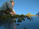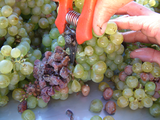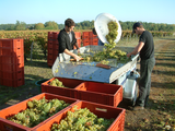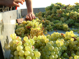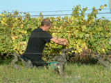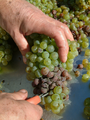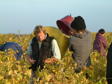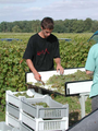 ![]() | VENDANGES L’équipe de vendangeurs formée à ce tri va prélever quelques fois des grappes entières, mais le plus souvent seulement des morceaux de grappes. La technique utilisée est complètement différente selon qu’il s’agit d’un grand millésime ou d’un millésime plus difficile. Dans ces conditions de ramassage, l’équipe, d’environ 30 personnes, cueille une quarantaine d’hectolitres par jour. La même équipe ramasserait, sans table de tri, plus de cent hectolitres dans la journée (trois fois plus). |
